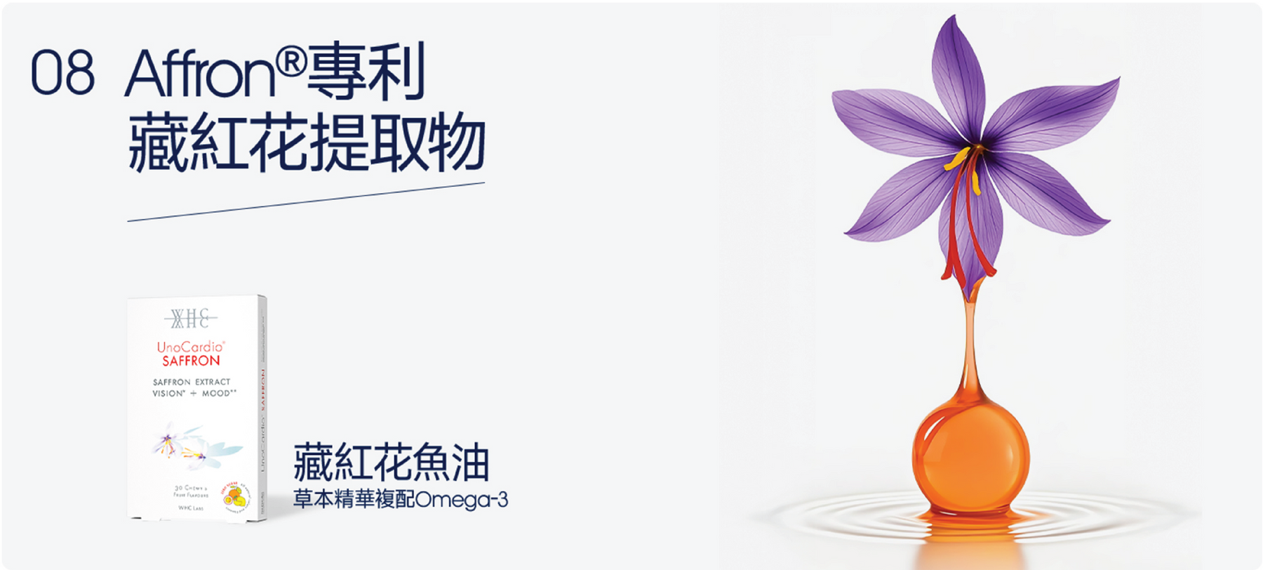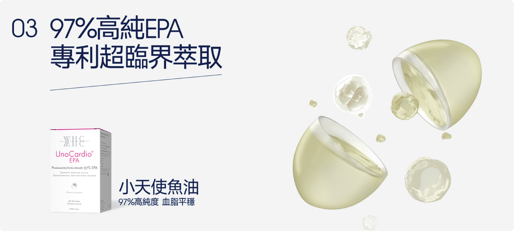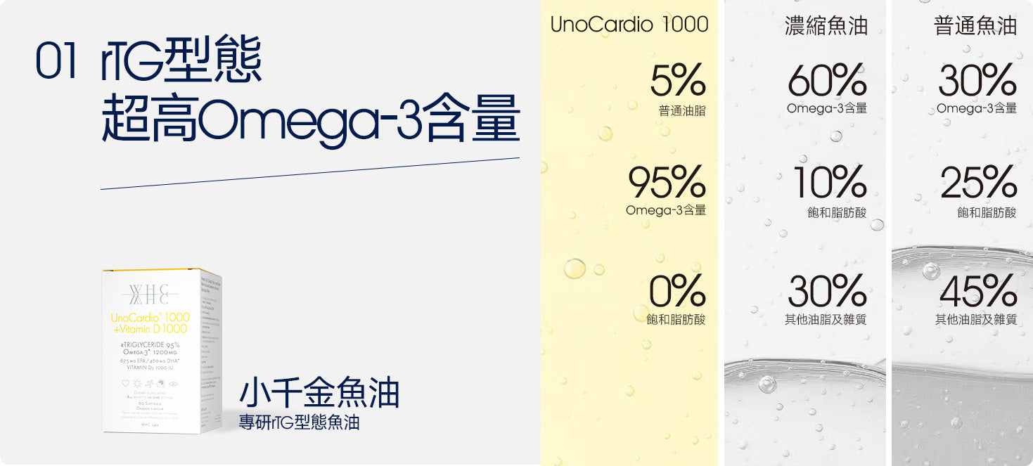 這些必需脂肪酸的健康益處已在許多研究中得到科學證明。WHC 的 UnoCardio® 補充劑含有 90–95% Omega-3,因此在單一軟膠囊中提供所需的 Omega-3,相當於 3-10 顆標準魚油軟膠囊。