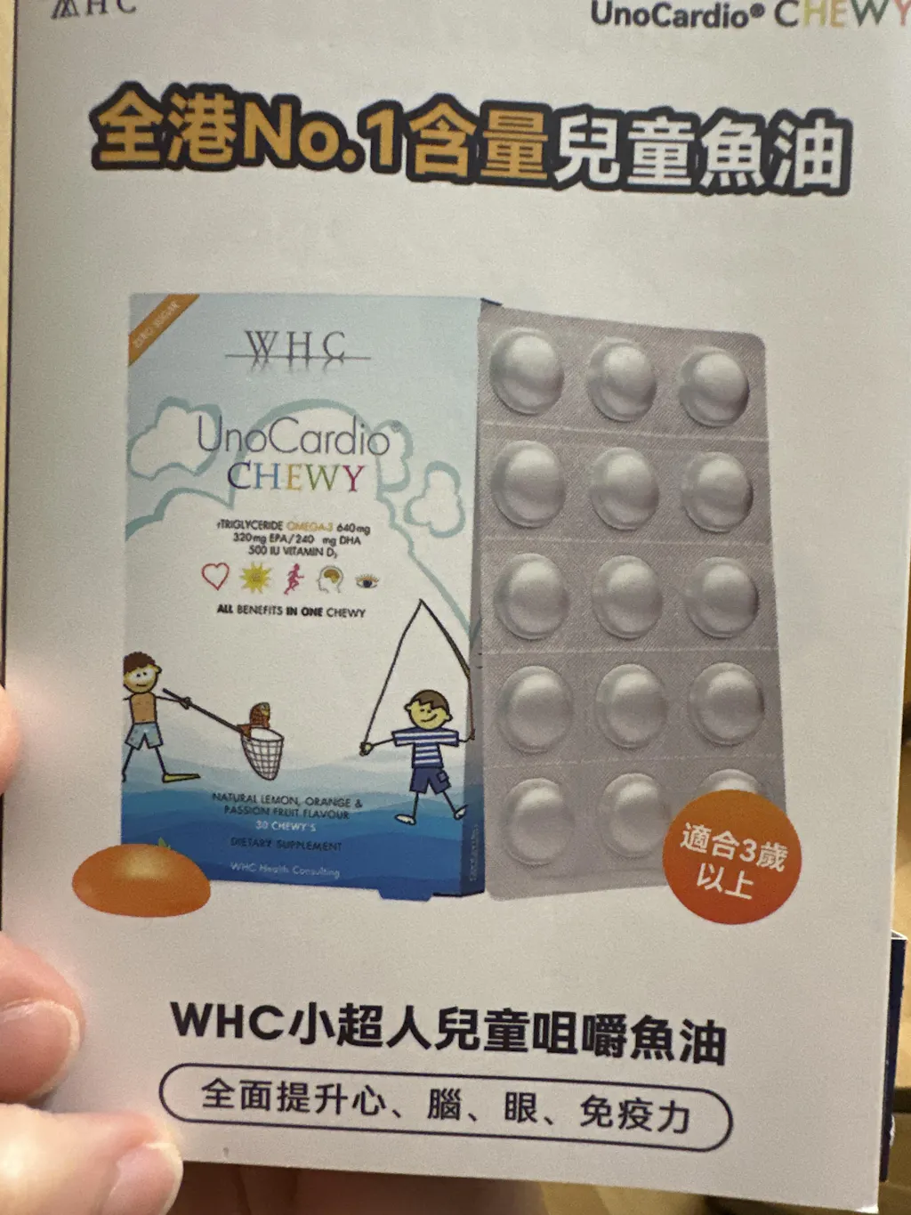 WHC小超人兒童咀嚼啫喱魚油碾壓「零食級軟糖」。市面軟糖常混入明膠蔗糖(Omega-3含量同吸收率低),小超人憑Concordix®專利技術將640mg高含量魚油製成酸甜啫喱,吸收率提高44%且零添加蔗糖,一粒等於三粒軟糖功效。